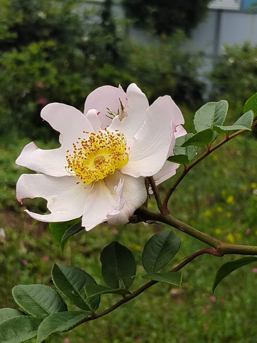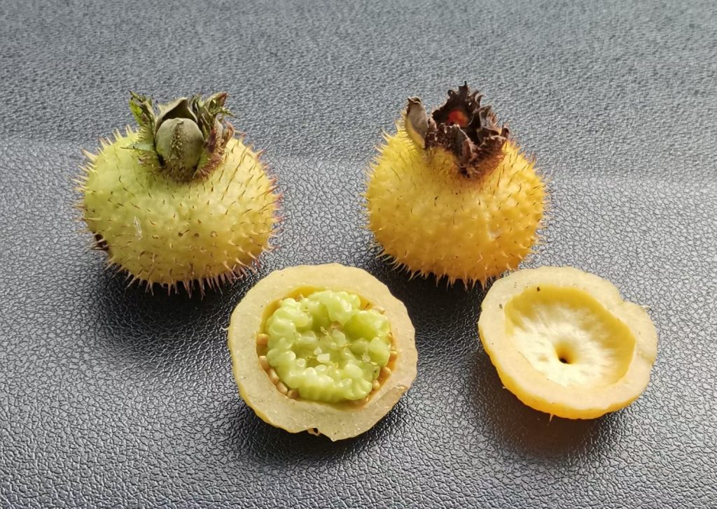 Yellow rosa roxburghii features pink blossoms and flattened, round fruits with yellow skin covered in dense spines. The flesh is white or yellow, and the fruit contains seeds.