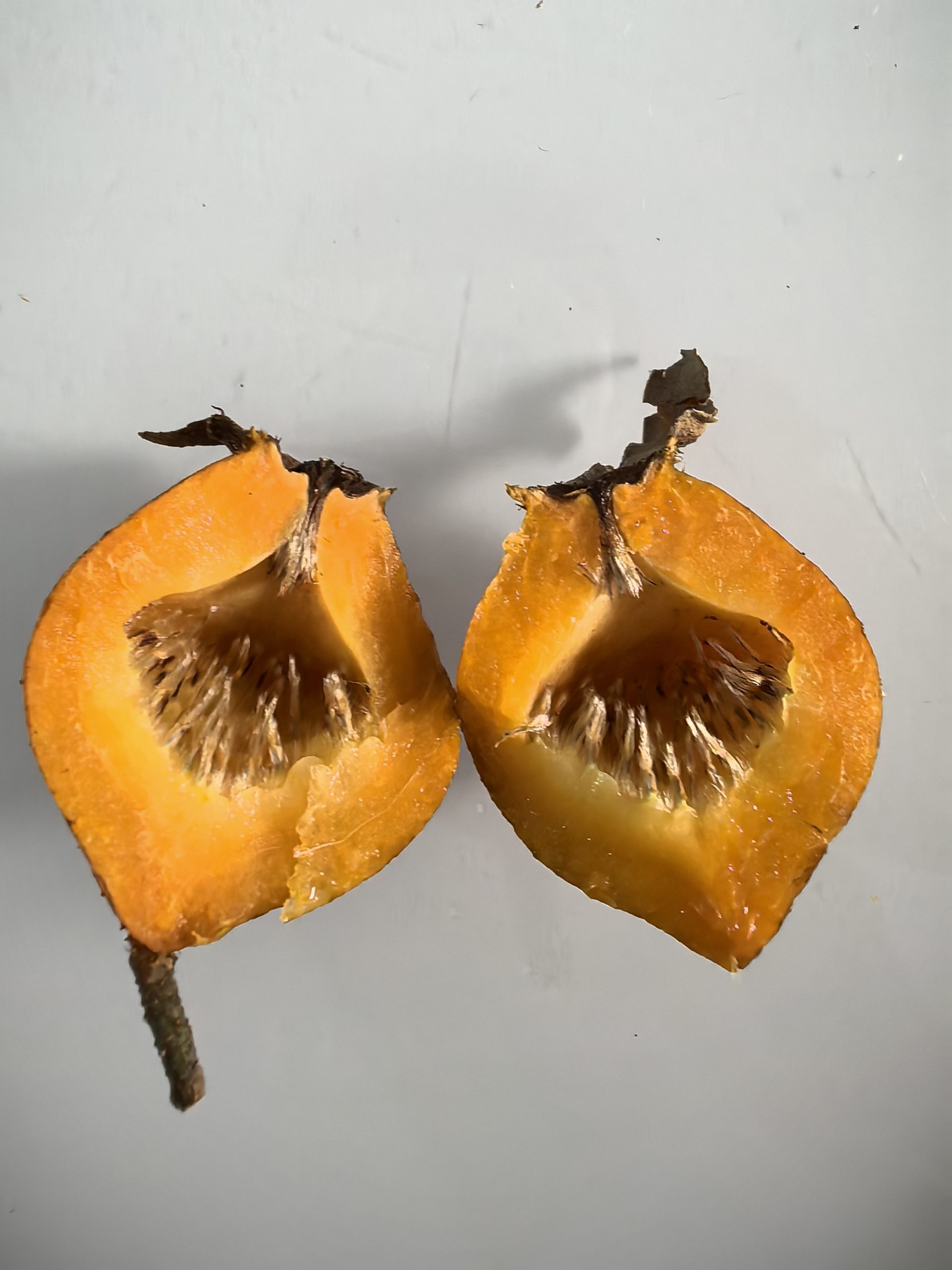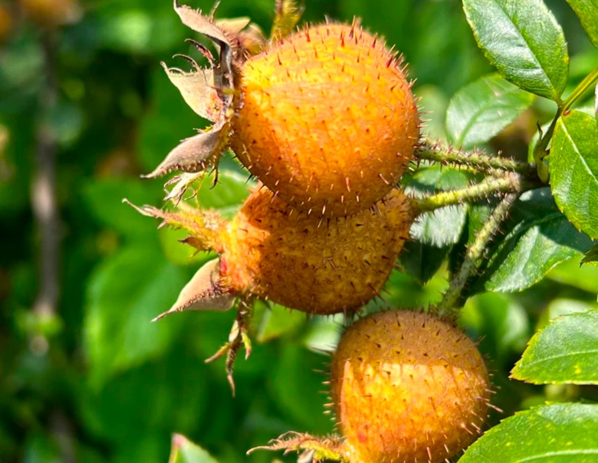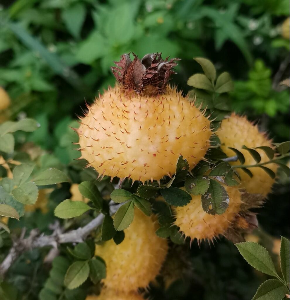 Golden rosa roxburghii This variety has white blossoms and spindle-shaped fruits with yellow-brown spiny skin. The flesh is orange-yellow, seedless, and contains six times the sugar content of the yellow variety.